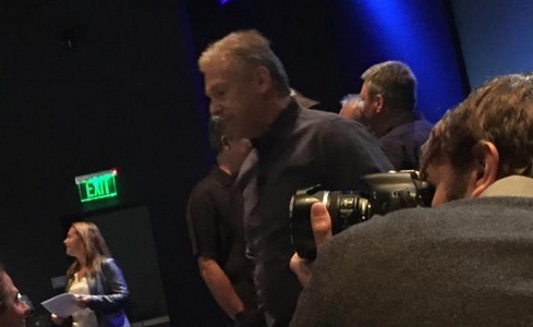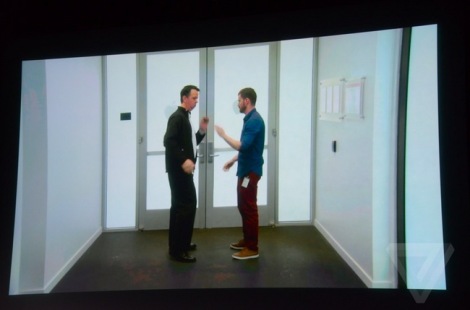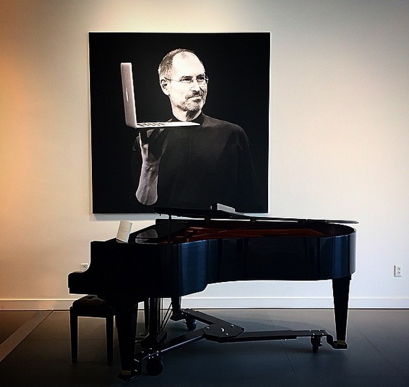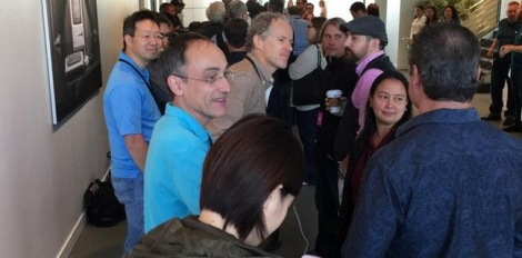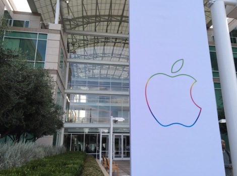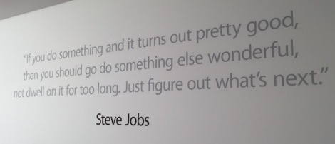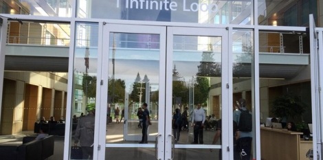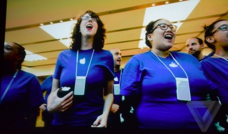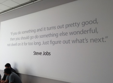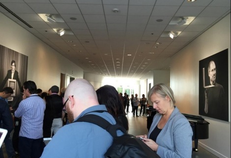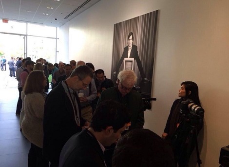 I giornalisti nel frattempo stanno entrando nella struttura per prendere posto nella sala conferenze. L'intero luogo è ricoperto da immagini e frasi di Steve Jobs in memoria dei primi prodotti Apple e del suo fondatore